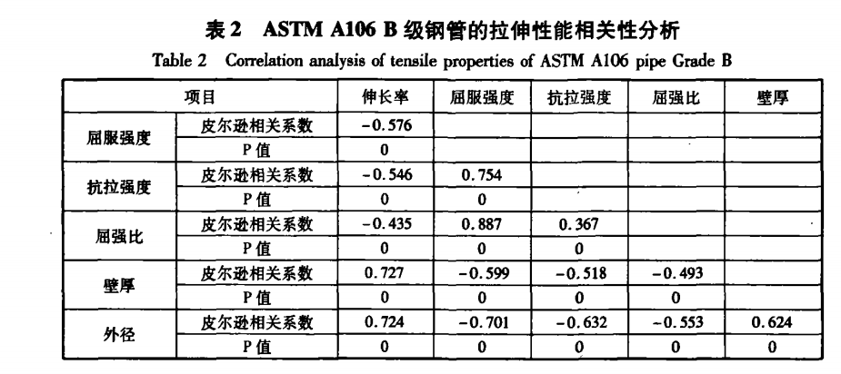 根據(jù)AsTM A106標(biāo)準(zhǔn)要求,B級熱軋無縫鋼 管的機(jī)械性能應(yīng)符合表l要求。歷史數(shù)據(jù)顯示,寶鋼以往生產(chǎn)的此類管件用 管的屈服強(qiáng)度為260一439加)a,均值為338.9 MPa, 標(biāo)準(zhǔn)差為23.77 MPa,其西格瑪水平為4.16;抗拉歷史數(shù)據(jù)顯示,寶鋼以往生產(chǎn)的此類管件用 管的屈服強(qiáng)度為260一439加)a,均值為338.9 MPa, 標(biāo)準(zhǔn)差為23.77 MPa,其西格瑪水平為4.16;抗拉采集了AsTM A106 B級鋼管的拉伸性能歷 史數(shù)據(jù),進(jìn)行相關(guān)性分析¨1(原假設(shè)為不相關(guān),備 擇假設(shè)為相關(guān),顯著性水平a取0.05),見表2。