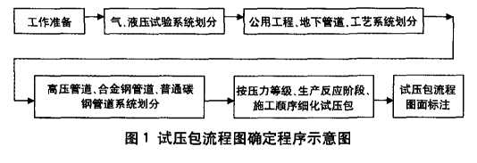 化 工裝置 的壓力 管道為方便壓力 試驗(yàn) ,通常是將管道 按照 不同的系統(tǒng)和作業(yè)條件 ,將其分成若干個(gè)獨(dú)立的小系統(tǒng) (試壓 包),試壓 工作人員 以試壓包為工作單位 ,逐一完成試壓工作 。試 壓包 的確定工作流程如 圖 1所示 。