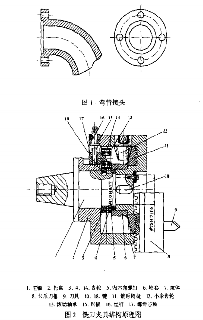 彎管接頭如圖1所示,它主要用于輸送液{本或氣 體物料的管道連接中。為了防漏,并增強(qiáng)密封性,因 此對(duì)彎管接頭法蘭盤表面的形位公差有較高的加工要 求加工其法蘭盤表面時(shí),由于工件形體較大,且形 狀復(fù)雜,在車床上加工裝夾困難。在無專用設(shè)備的情 況下,利用一齒差機(jī)構(gòu)原理將普通機(jī)床的三爪卡盤改 裝成銑刀夾具如圖2所示。采用這種夾具可在普通銑 床上加工彎管接頭法蘭盤表面。